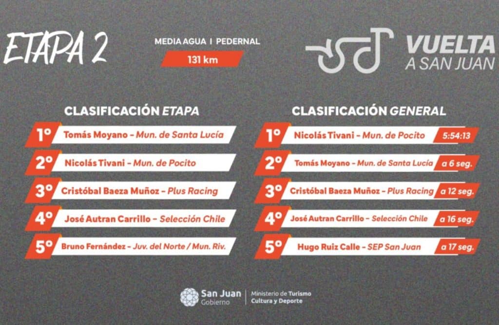 In the Under-23 category, Chilean Martín Mancilla Labrin of Stamina Racing took the victory, while Tivani remains the top San Juan rider. Moyano also won the mountain classification, and Leandro Velardez of Pocito took the sprint finish.