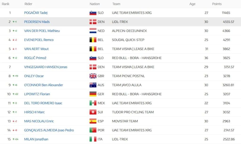 The ranking, which takes into account results in all UCI races over the past 52 weeks, remains led by Pogacar (UAE Team Emirates), who remains at the top of the world rankings by a wide margin (11,465 points).